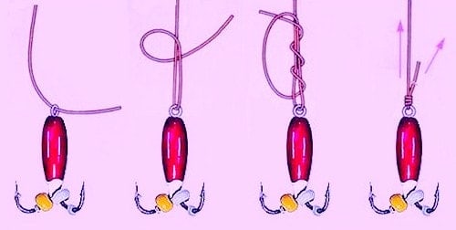 Это лишь один пример крючкового способа: по такому же принципу вяжется и работает в ходе ловли упомянутое ниже «веретено».