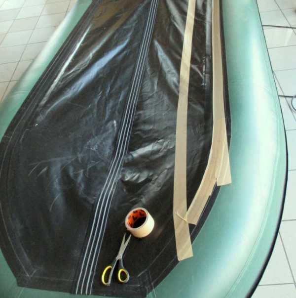 Перед процессом приклеивания, необходимо полностью оторвать дно от лодки, после чего, прогреть его феном и хорошо зачистить наждачной бумагой. Затем нужно приклеить заделочную ленту. Лишь после этого, следует приступить к приклеиванию днища.