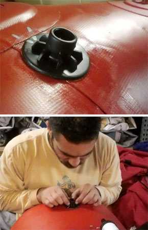 Вместе с внешней заплаткой, необходимо также наложить заплатку с внутренней стороны днища и перешить место прокола нитками для лучшей прочности. Площадь заплатки и прилегающие к ней области обработать валиком с клеем, чтобы избежать затекания воды внутрь лодки.