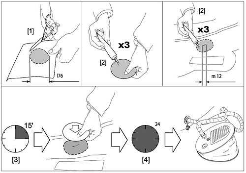 Совмещаем поверхности по ранее нанесённому контуру. Внимательно следим, чтобы они совпали. Надо прогладить чем-то тяжёлым, чтобы выгнать, из-под заплаты, возможные пузырьки с воздухом.- Порез более пяти сантиметров считается большим. Для его устранения ставят две заплаты. Вышесказанным способом, только одна внутри другой. Это делается для большей гарантии прочности, таким образом, получим герметичный и прочный ремонт. Первая заплата на 2 см больше пореза, а вторая на 2 см по окружности, больше первой латки.