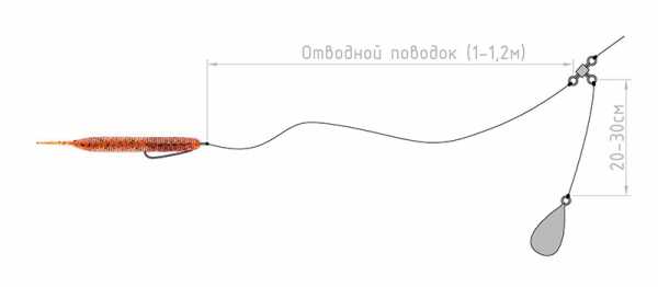 Видите схему монтажа отводного поводка на спиннинг. Конструкция очень проста. Основная леска, на конце которой привязывается грузило. Способы привязки крючков, грузил смотрите здесь.