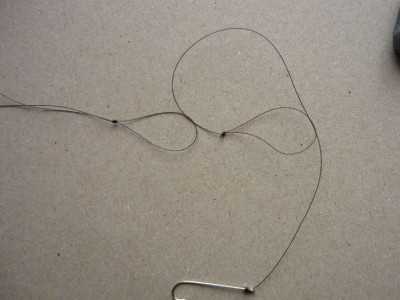 Вяжутся две обычные, но удлинённые петли на концах искомого поводка и основной лески.