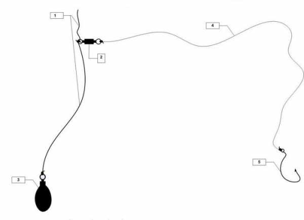 - Ко второму ушку вертлюжка привязан отводной поводок из монолески или флюрокарбона с крючком на конце (4 и 5).