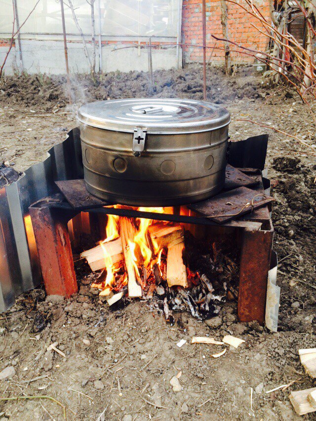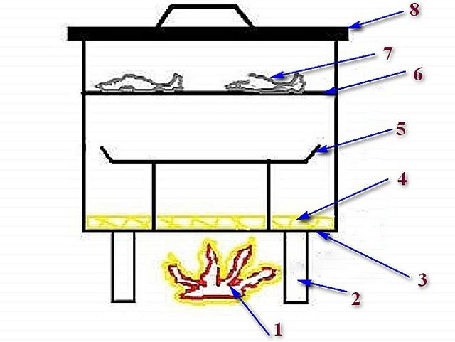 Самый простой вариант коптильни – металлический короб, в котором внутри есть решётка для продуктов и поддон для щепы. Короб закрывается на крышку и ставится на открытый огонь. Опилки тлеют с повышением температуры внутри короба. Продукты при этом обрабатываются горячим дымом и завариваются от жара.