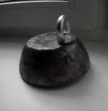 С другой стороны данного веретена делается так называемая проушина, которая необходима для каната. Далее на данную резьбу надевается специальная гайка, а уже потом плоский, круглой формы груз из свинца. Его вес должен составлять примерно один килограмм. Уже потом необходимо надеть эту сковороду, она должна будет зажаться с помощью шайбы за счет еще одной гайки.