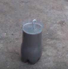 Представляем еще один вариант, как сделать якорь из подручных средств. Для этого нам потребуется пакет цемента определенного веса. Разводим цемент в воде в соотношении по объему 1 к 4. Для размешивания используем специальный венчик. После получения цемента его заливаем в емкость. В нашем случае мы будем использовать часть пластиковой бутылки. В результате получим якорь весом 5-6 кг. Для получения более тяжелого изделия используем емкость большего объема и больше цемента. После заливки цемента берем заготовку из толстой проволоки или металлическую скобу и вставляем ее в цемент. Получится вот так: