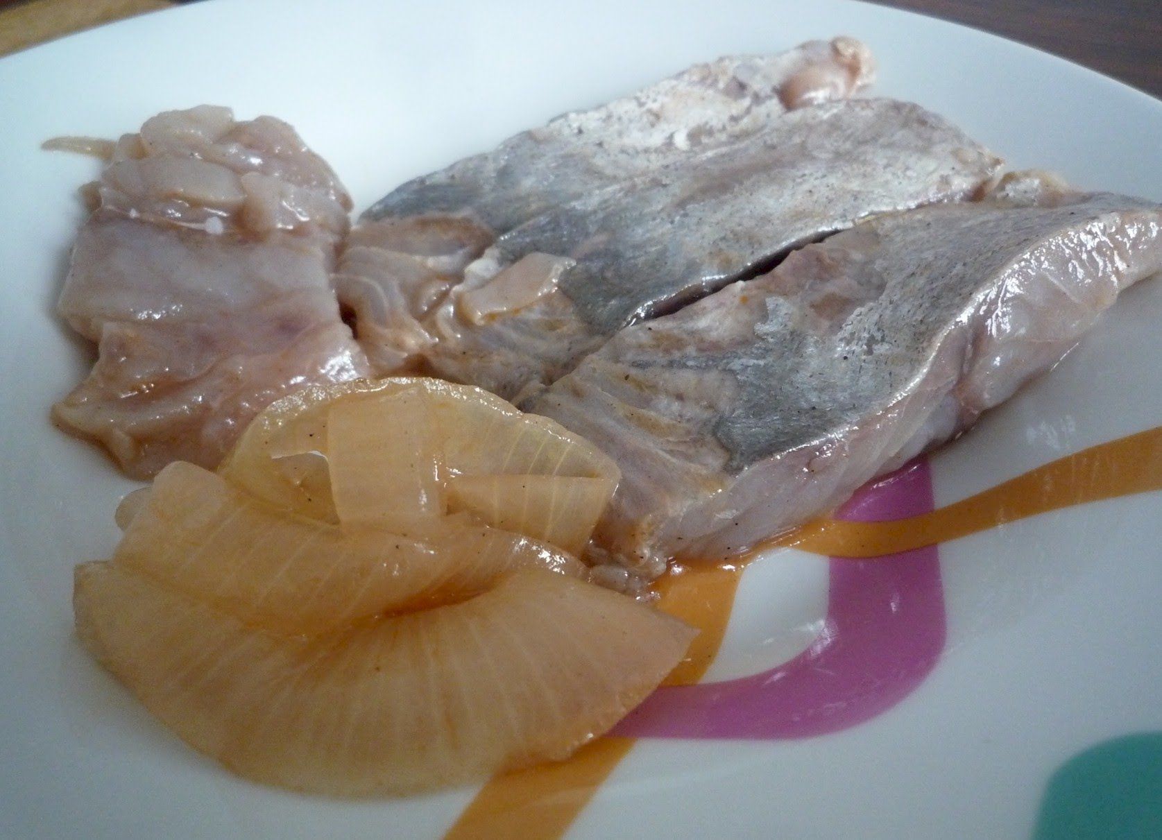 Перед подачей к столу нарезаем рыбу порционными кусками, покрываем кольцами лука и сбрызгиваем лимонным соком.