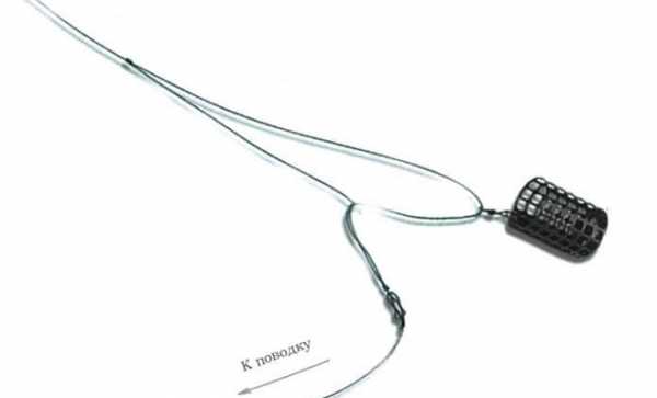 Через длинную сторону лески продевается вертлюжок, предназначенный для крепления кормушки. Далее отмеряется необходимая длина асимметричной петли (30-70 см), и она затягивается с помощью двойного узла.