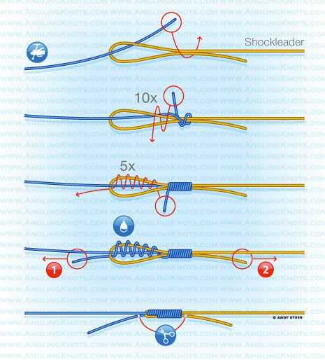 Во-первых, в процессе вязки обязательно следите за тем, чтобы петля не затянулась до того, как вы сделаете 10 обратных витков лески к началу. Во-вторых, когда вы затягиваете узел, обязательно помогайте виткам стянуться. Если этого не сделать, петля прочно затянется, но сами витки не будут прочно прилегать к ней и конструкция не будет достаточно прочной. В-третьих, леску и плетенку нужно обязательно смачивать водой перед затягиванием, чтобы ни один из материалов не повредился из-за сильного трения.