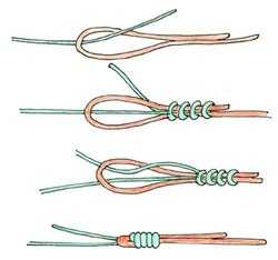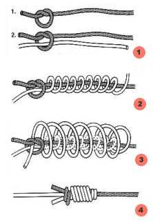 - Затягивают узел, не помогая виткам стянуться (помогать надо руками, сдвигая витки ближе первому узлу.