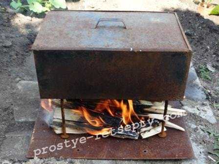 Желательно иметь подставку под коптильню, т. к. на водоеме не всегда можно найти камни, а если взять в качестве опор бревна, то они попросту сгорят. Высота подставки должна быть не меньше 30 см. Надежная подставка не позволит допустить опрокидывания коптильни.