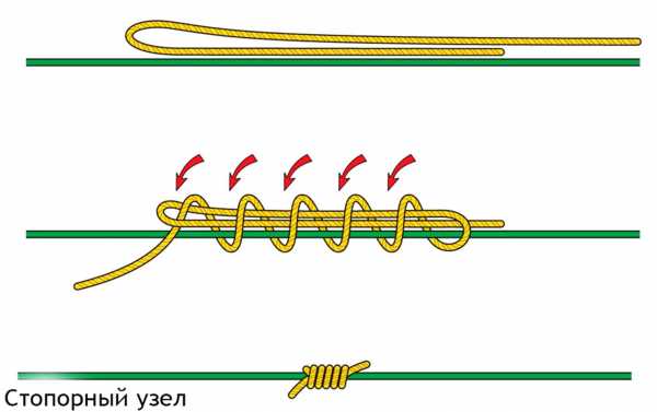Стопорный узел из лески вяжется леской того же диаметра и типа, что и основная, или чуть толще. Его вяжут следующим образом:
