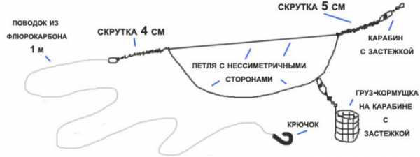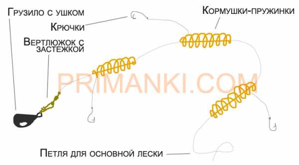 Повторяться не будем – об этой снасти есть подробная статья на нашем сайте. А представляет из себя конструкция обычную фидерную донку с 3 кормушками и 3 крючками.