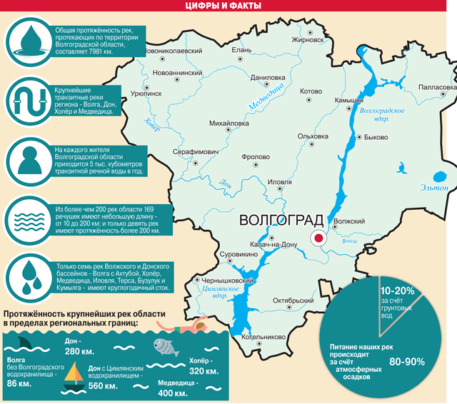 Волгоградская область расположена на юге России и граничит с Саратовской, Ростовской, Астраханской и Воронежской областями, Республикой Калмыкией и Казахстаном. С севера на юг и с запада на восток область протянулась более чем на 400 км. Здесь есть леса, болота, степи, полупустыни и даже настоящие пустыни. По территории Волгоградской области протекает около 200 рек. Самые известные из них – Волга и Дон.