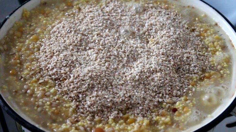 - В теплую смесь добавляется по 3 стакана ячневой крупы и кукурузной.