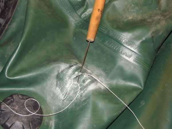 - Перед наклейкой латок, требуется сшить повреждённый материл капроновыми нитями. Для этого разошедшиеся части необходимо стянуть друг к другу, проколоть иглой, зафиксировать нитью.