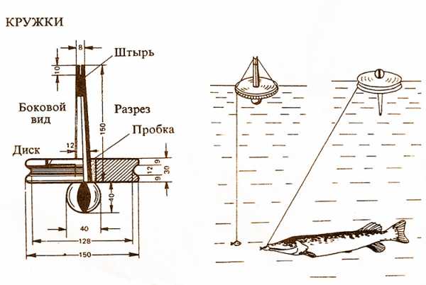 Основу этой снасти составляет пенопластовый (или деревянный) диск, толщиной 2,5-3см и диаметром 13-15см. в торце диска, по его окружности имеется канавка, в которой хранится леска. В верхней части диска должны быть предусмотрены прорезы для фиксации лески как при хранении, так и после установки кружка. В центре диска следует проделать отверстие для установки палочки. Для того, чтобы кружок было далеко видно, его окрашивают в два разных цвета: одна часть кружка (верхняя) окрашивается в красный цвет, а другая – в белый. Поскольку пенопласт имеет, в основном, белый цвет, то нижнюю часть можно и не красить.