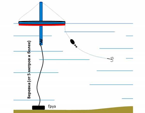 Оснастка стационарного варианта кружка несколько отличается от оснастки классического плавающего. Здесь используется более тяжелое грузило. Оно закрепляется непосредственно на конце лески (будет лежать на дне и удерживать снасть на месте), а в полуметре сверху устанавливается поводок с крючком.