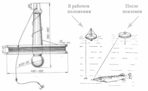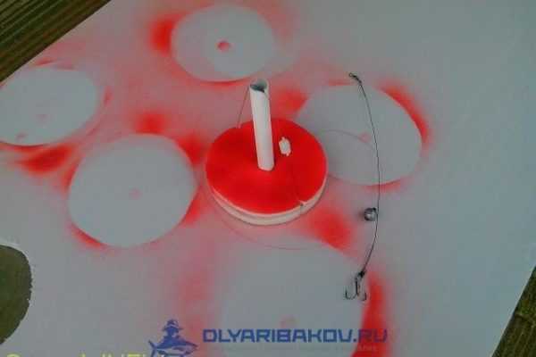 В центре вырезанного круга необходимо просверлить отверстие ø 6-8 мм. На плоскости, которая будет верхней, нужно сделать 2-4 прорези для фиксации лески. Штырь-мачту можно изготовить из деревянной планки длиной 150 мм. Мачта и диск окрашиваются в 2 цвета: красный и белый. Остается намотать леску, прикрепить к ней поводок с грузиком и крючками.