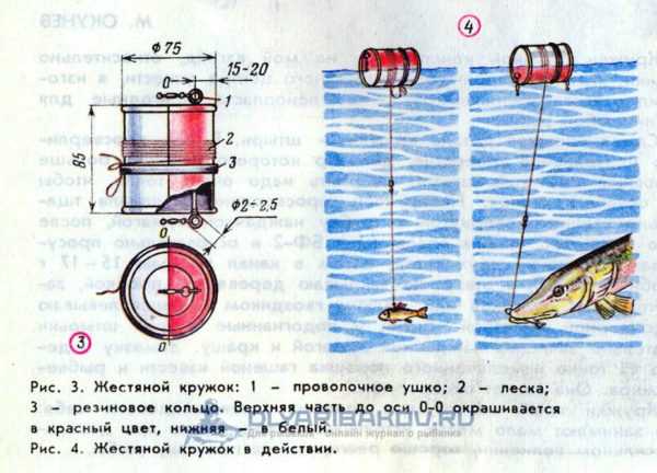 В верхней части кружка на противоположных сторонах предусмотрены две небольшие прорези для лески, еще одна прорезь сделана верхней части штырька. Прорези необходимы для фиксации лески в рабочем состоянии, перед установкой кружков на воду в местах лова.
