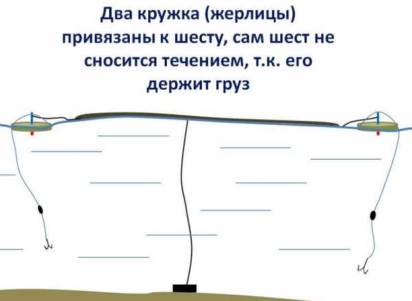 В водоемах с постоянным течением, для фиксации кружка на месте берется дополнительное грузило. Оно фиксируется на конце лески. Течение не может снести снасть слишком далеко. Живец цепляется крючком на небольшой кусок лески, который петлей крепится к основному шнуру. Так наживка может перемещаться от грузила до кружка.