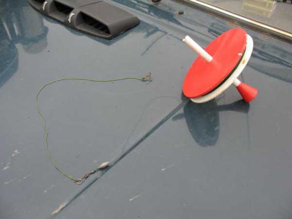 Кружок выполнен из древесины или из другого легкого и достаточно прочного материала. Мастера-самодельщики рекомендуют его делать из липы. Но дерево от воды намокает, поэтому в последние годы приспособление чаще всего делают из пенопласта, который применяется в упаковках. Обычная толщина кружка — 25-30 мм. В нем по окружности прорезается канавка для лески. В центре его располагается отверстие, в которое вставляется штырь (фото № 2). В верхней плоскости кружка делают прорези. В них фиксируется леска. Верхняя плоскость окрашивается в красный цвет, нижняя — в белый.