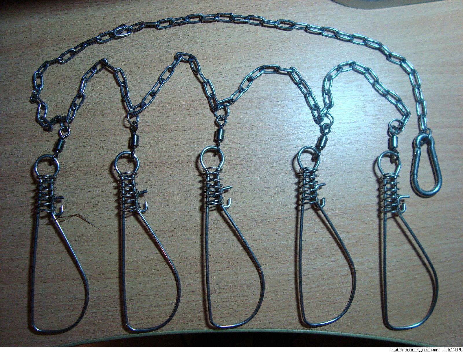 Такой кукан не путается при движении лодки, проходит по траве, не цепляясь за нее. Когда встаешь на якорь, цепь своим весом притапливает рыбу, так что та не болтается на поверхности.