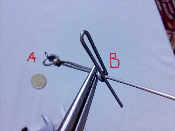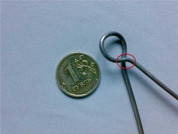 - Длинный конец проволоки сгибаем большой петлей, так чтобы отогнутый конец защелкивался в приготовленном фиксаторе.