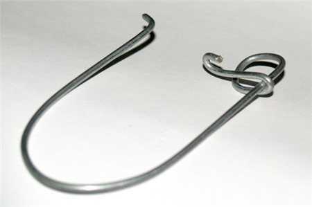 Затем на кольцо необходимо прикрепить шнур, длинной до 2-х метров. Хотелось бы отдельно рассмотреть кукан для щук, так называемый, кукан-застёжка (рис. 4.). Концы отрезков проволоки из стали, длинной около 50 см, расклепывают, предварительно нагрев их до красна. Затем, на расклепанных концах необходимо сделать отверстие, а на другом крючок, который и будет служить застёжкой.