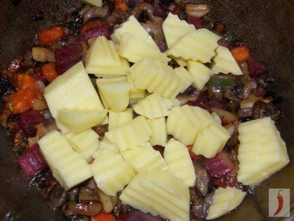 Когда грибы будут выглядеть поджаристыми, добавляем в казан нарезанный картофель и горсть промытого пшена.