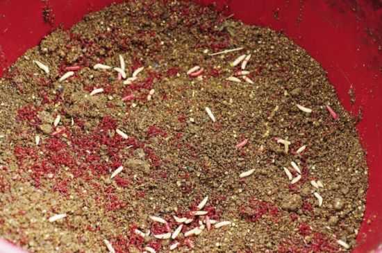 В состав прикормки обязательно должна входить наживка, которая будет использоваться в данном случае. Если для ловли выбран опарыш, то его нужно включить в смесь в рубленом виде. Это касается и других видов наживок (червяка и мотыля). При использовании растительных насадок, основным компонентом прикормочной смеси может быть зелёный горошек, также можно использовать перловку либо другую кашу.