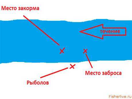 Так же важно правильно выбрать место закорма. Лучше всего кормить ниже течения, а оснастку забрасывать немного выше своего положения.
