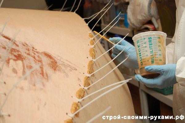 ΠΠ»Ρ Π±ΠΎΠ»ΡΡΠ΅ΠΉ ΠΏΡΠΎΡΠ½ΠΎΡΡΠΈ ΠΈ ΠΈΡΠΊΠ»ΡΡΠ΅Π½ΠΈΡ ΠΏΡΠΎΡΠ΅ΠΊΠ°Π½ΠΈΡ Π»ΠΎΠ΄ΠΊΡ Π½ΡΠΆΠ½ΠΎ ΠΎΠ±ΡΡΠ½ΡΡΡ ΡΠΊΠ°Π½ΡΡ. ΠΠ»Ρ ΡΡΠΎΠ³ΠΎ ΡΡΠΈΠ²Π°Π΅ΡΡΡ ΡΠ΅Ρ ΠΎΠ», ΠΊΠΎΡΠΎΡΡΠΉ Π±ΡΠ΄Π΅Ρ ΠΏΠΎΠΊΡΡΠ²Π°ΡΡ Π΅Ρ Π΄ΠΎ Π±ΠΎΡΡΠΎΠ². ΠΠΎΡΠ»Π΅ ΡΡΠΎΠ³ΠΎ Π΄Π΅Π»Π°ΡΡΡΡ ΡΠ°Π»ΡΡΠΊΠΈΠ»ΠΈ Π΄Π»Ρ ΡΡΡΠ°Π½ΠΎΠ²ΠΊΠΈ ΠΈΡ Ρ Π²Π½Π΅ΡΠ½Π΅ΠΉ ΡΡΠΎΡΠΎΠ½Ρ Π΄Π½ΠΈΡΠ° ΡΡΠ΄Π½Π°. Π ΡΠΏΠ°Π½Π³ΠΎΡΡΠ°Ρ ΡΠ°Π»ΡΡΠΊΠΈΠ»Π΅ΠΉ ΡΠ²Π΅ΡΠ»ΡΡ ΠΎΡΠ²Π΅ΡΡΡΠΈΡ Π΄Π»Ρ ΠΈΡ Π΄Π°Π»ΡΠ½Π΅ΠΉΡΠ΅Π³ΠΎ ΡΠΊΡΠ΅ΠΏΠ»Π΅Π½ΠΈΡ.