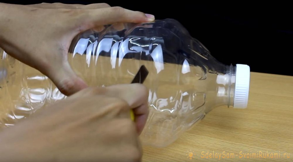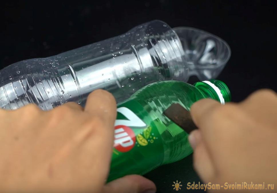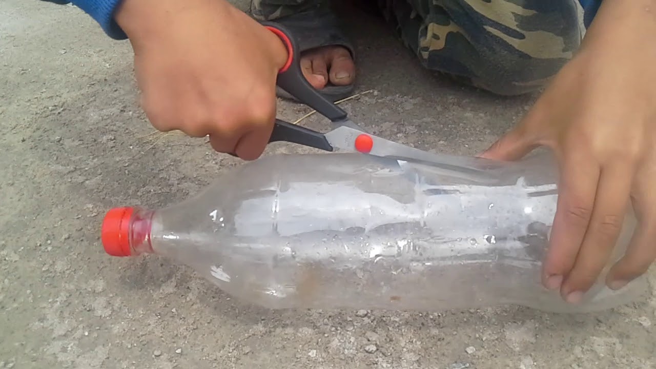 Шаг 1. Разрежьте 1-литровую бутылку в двух местах ) бутылку вверх (используют универсальный нож) — затем используйте ножницы, чтобы завершить полный разрез вокруг бутылки.