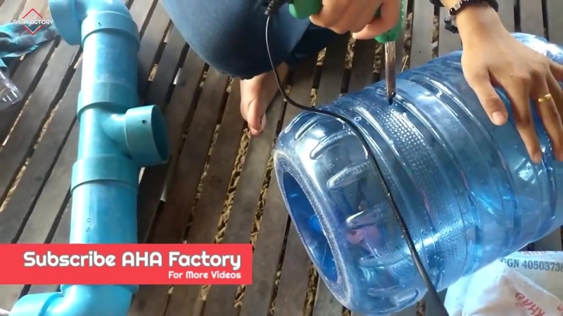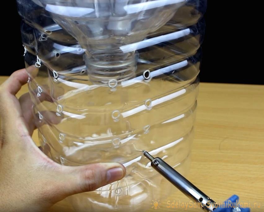 Здесь демонстрация показывает, как парень использует горячую точку (может быть, паяльник или подобный инструмент), чтобы проткнуть серию отверстий по всей бутылке. Это помогает поддерживать течение воды, чтобы рыба оставалась живой, когда она находится в ловушке. Если вы делаете это с детьми, тщательно контролируйте это и выполняйте эту часть самостоятельно, если они недостаточно опытны, чтобы безопасно протыкать отверстия.