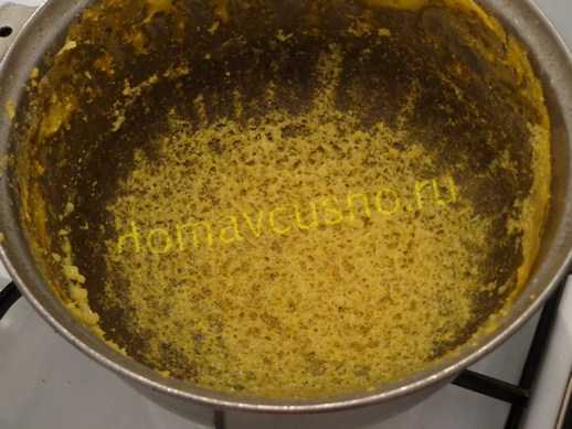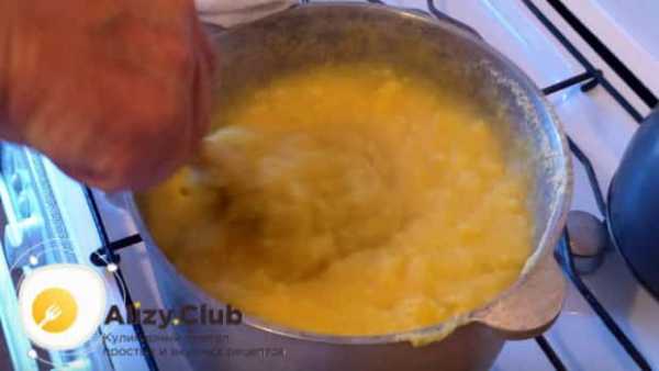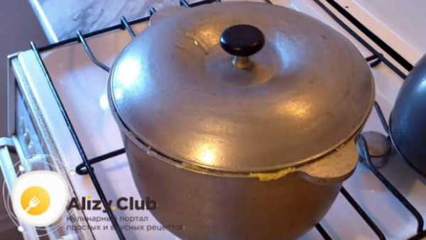 ΠΠ°ΡΠ΅ΠΌ ΠΌΠ°ΠΌΠ°Π»ΡΠ³Ρ ΡΡΠ°Π²ΡΡ Π½Π° ΠΌΠΈΠ½ΠΈΠΌΠ°Π»ΡΠ½ΡΠΉ ΠΎΠ³ΠΎΠ½Ρ ΠΈ ΠΎΡΡΠ°Π²Π»ΡΡΡ ΡΠΎΠΌΠΈΡΡΡΡ ΠΏΠΎΠ΄ ΠΊΡΡΡΠΊΠΎΠΉ Π² ΡΠ΅ΡΠ΅Π½ΠΈΠ΅ ΠΏΠΎΠ»ΡΡΠ°ΡΠ°. ΠΠ°Π»Π΅Π΅ ΠΊΡΡΡΠΊΡ ΡΠ±ΠΈΡΠ°ΡΡ, ΡΡΠΎΠ±Ρ Π²ΡΠΏΠ°ΡΠΈΡΡ Π²ΠΎΠ΄Ρ. ΠΠΌΠΊΠΎΡΡΡ Π½Π°ΠΊΡΡΠ²Π°ΡΡ Π΄Π΅ΡΠ΅Π²ΡΠ½Π½ΠΎΠΉ Π΄ΠΎΡΠ΅ΡΠΊΠΎΠΉ ΠΈ ΠΏΠ΅ΡΠ΅Π²ΠΎΡΠ°ΡΠΈΠ²Π°ΡΡ, ΡΡΠΎΠ±Ρ ΠΈΠ·Π²Π»Π΅ΡΡ Π³ΠΎΡΠΎΠ²ΠΎΠ΅ Π±Π»ΡΠ΄ΠΎ. ΠΠ³ΠΎ Π½Π΅ΠΎΠ±Ρ ΠΎΠ΄ΠΈΠΌΠΎ Π½Π°ΡΠ΅Π·Π°ΡΡ ΠΊΡΡΠΊΠ°ΠΌΠΈ, Π΄ΠΎΠ±Π°Π²ΠΈΡΡ ΡΠΊΠ²Π°ΡΠΊΠΈ ΠΈ Π½Π°ΡΠ΅ΡΡΡΡ Π±ΡΡΠ½Π·Ρ.
