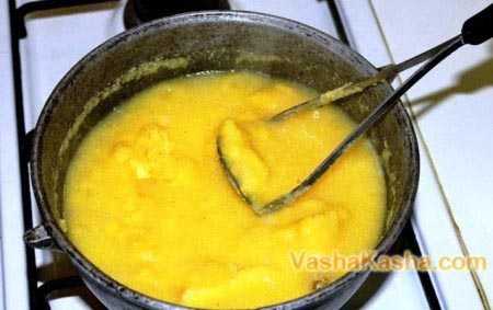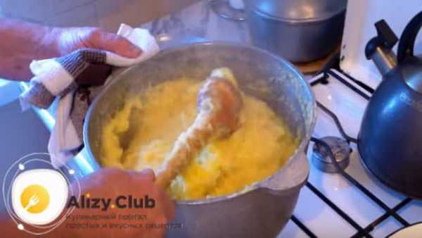 ΠΠ°ΡΠΈΡΡ ΠΌΠ°ΠΌΠ°Π»ΡΠ³Ρ ΡΡΠ΅Π±ΡΠ΅ΡΡΡ ΠΎΠΊΠΎΠ»ΠΎ ΠΏΠΎΠ»ΡΡΠ°ΡΠ° Π½Π° ΠΌΠ΅Π΄Π»Π΅Π½Π½ΠΎΠΌ ΠΎΠ³Π½Π΅, Π½Π΅ΠΏΡΠ΅ΡΡΠ²Π½ΠΎ ΠΏΠΎΠΌΠ΅ΡΠΈΠ²Π°Ρ. Π Π²ΠΎΠ΄Ρ, Π΄ΠΎΠ²Π΅Π΄Π΅Π½Π½ΡΡ Π΄ΠΎ ΠΊΠΈΠΏΠ΅Π½ΠΈΡ Π² ΡΡΠ³ΡΠ½Π½ΠΎΠΌ ΠΊΠ°Π·Π°Π½ΠΊΠ΅ ΠΈΠ»ΠΈ ΠΊΠΎΡΠ΅Π»ΠΊΠ΅, ΡΠΎΠ½ΠΊΠΎΠΉ ΡΡΡΡΠΉΠΊΠΎΠΉ Π΄ΠΎΠ±Π°Π²Π»ΡΡΡ ΠΌΡΠΊΡ. ΠΠ΅ ΠΆΠ΅Π»Π°ΡΠ΅Π»ΡΠ½ΠΎ ΠΏΡΠ΅Π΄Π²Π°ΡΠΈΡΠ΅Π»ΡΠ½ΠΎ ΠΏΠΎΠ΄ΡΡΡΠΈΡΡ Π² Π΄ΡΡ ΠΎΠ²ΠΊΠ΅. ΠΠ΅ΡΠ΅Π²ΡΠ½Π½ΡΡ ΠΌΠ΅ΡΠ°Π»ΠΊΡ Π½ΡΠΆΠ½ΠΎ ΡΠΌΠΎΡΠΈΡΡ Π² Ρ ΠΎΠ»ΠΎΠ΄Π½ΠΎΠΉ Π²ΠΎΠ΄Π΅, ΡΡΠ°ΡΠ΅Π»ΡΠ½ΠΎ ΠΎΡΠ΄Π΅Π»ΠΈΡΡ ΠΏΠΎΠ»ΡΡΠΈΠ²ΡΡΡΡΡ ΠΌΠ°ΡΡΡ ΠΎΡ ΡΡΠ΅Π½ΠΎΠΊ, Π΄Π°ΡΡ Π΅ΠΉ ΠΏΠΎΡΠΎΠΌΠΈΡΡΡΡ Π΅ΡΠ΅ ΠΏΠ°ΡΡ ΠΌΠΈΠ½ΡΡ ΠΈ, Π²ΡΡΡΡΡ Π½ΡΠ² ΠΊΠΎΡΠ΅Π»ΠΎΠΊ Π½Π΅ΡΠΊΠΎΠ»ΡΠΊΠΎ ΡΠ°Π·, Π²ΡΠ»ΠΎΠΆΠΈΡΡ Π½Π° ΠΊΡΡ ΠΎΠ½Π½ΠΎΠ΅ ΠΏΠΎΠ»ΠΎΡΠ΅Π½ΡΠ΅ ΠΈΠ»ΠΈ Π΄ΠΎΡΠΊΡ.