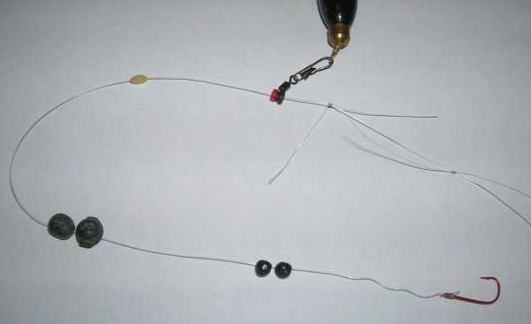 Для монтажа данной снасти мы используем монофильную леску того же диаметра, что и при глухом, длина всей оснастки около 40 см. К краю лески вяжем вертлюжок, затем через противоположный конец продеваем бусинку или силиконовый стопорок, их задача заключается в том, чтобы узел не бился о кормушку. После продеваем кормушку, опять пропускаем бусинку или стопорок и вяжем вертлюжок, бусинка и стопорок подбираются такого диаметра, дабы туго сидели на леске и не гуляли. Резиновый стопорок можно натянуть на вертлюжок. При этом размер бусинки или стопорка не должны позволять вертлюжку войти в тело кормушки. После к вертлюжку вяжем повадок длиною 7-10 см. Отличием от глухого монтажа является то, что оснастка будет свободно скользить вдоль по леске.