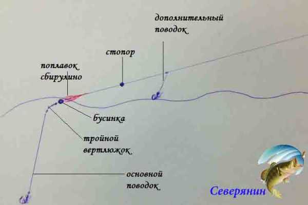- с помощью двух стопоров поплавок фиксируется на основной леске так, чтобы при забросе он не сполз выше или на поводок;