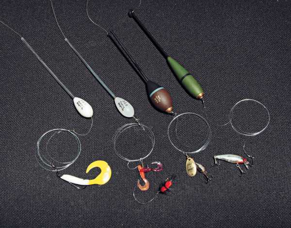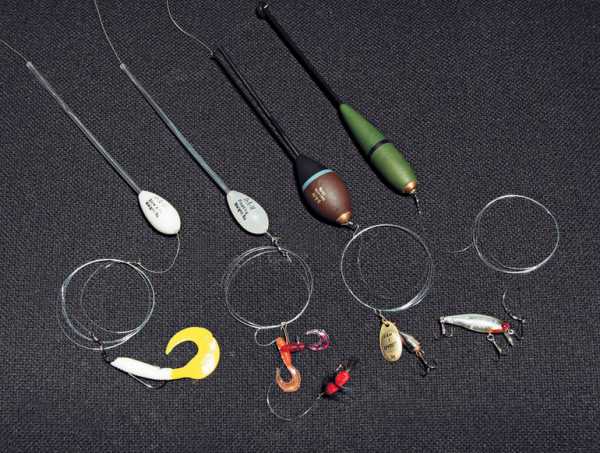 При проводках оснастка имеет свойства вращаться, а иногда и перекручиваться, поэтому вертлюжки стоит приобретать исключительно тройные самых разнообразных конструкций. Поводок можно сделать из надежной монолески прозрачного цвета. Длина поводка должна составлять 3 метра.Приманку подвязываем как к длинному, так и к коротким поводкам, которые помогут разнообразить игру и внимание рыбы будет с успехом привлечено. Однако, стоит заметить, что при забросах короткие поводки могут запутываться.