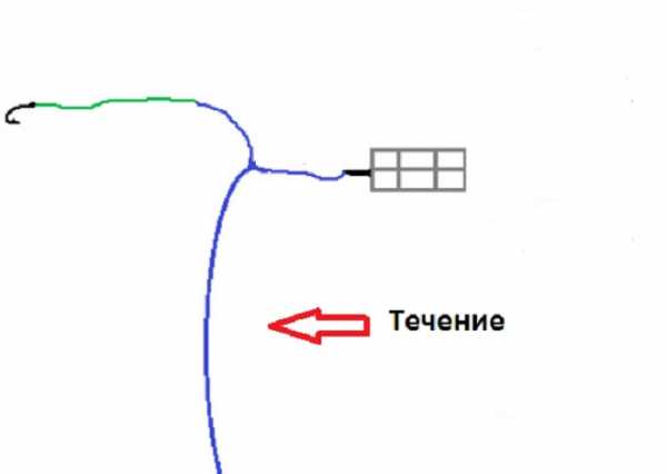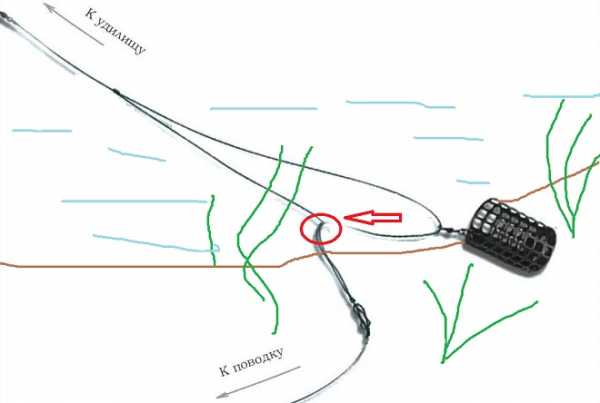 Из-за этого у начинающих рыболовов возникают иллюзии, что смысл монтажа – в прямой линии между крючком и основной леской, а грузило (кормушка) на отводе. На самом деле, такое положение – только на рисунке. После заброса прямая линия образуется между удилищем и кормушкой, а поводок – отвод вбок от основной лески.