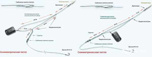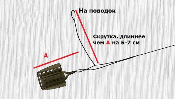 Этот монтаж оснастки фидера вяжется также, как и предыдущий. Однако, плечо петли, на котором закреплена кормушка, делается длиннее на несколько сантиметров. При натяжке основной лески во время нахождения асимметричной петли в воде узел отвода на поводок отдаляется от кормушки на это же расстояние и чуть приподнимается над ним (так как рабочая часть расположена ниже, чем рыболов на берегу). Поэтому ни тина и ил, ни мелкие предметы на дне – не мешают передаче воздействия от поводка к скрутке и дальше на квивертип через основную леску.