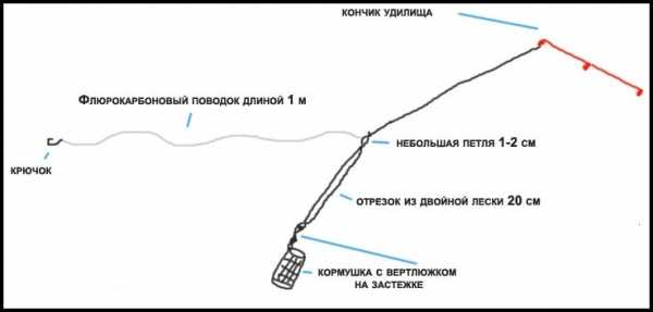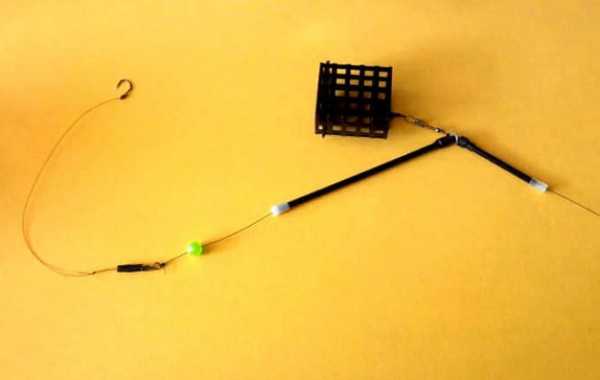 Еще один простой монтаж при ловле в водоемах без течения или со слабым течением. Основной способ применения – ловля активной рыбы. Отличные результаты дает при ловле карпа и карася на коммерческих водоемах. Его преимущество в том, что поводок располагается в непосредственной близости от кормушки и поклевка моментально передается на вершинку удилища.