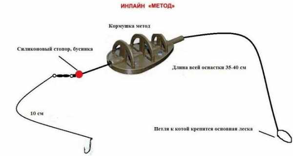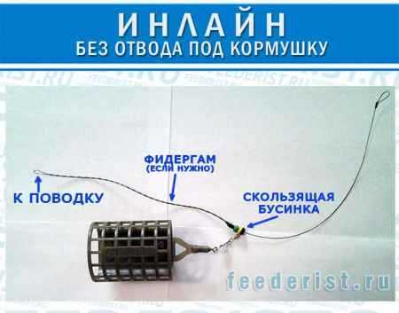 - Фидерная оснастка инлайн. Кормушка скользит по основной леске благодаря тому что она закреплена лишь на карабине. Точки перемещения обычно фиксируются с помощью специального стопора. К концу основной лески крепят поводок.