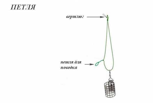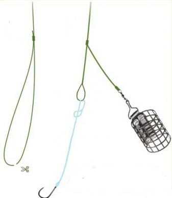 Вяжется он очень просто. Основная леска складывается вдвое так, чтобы получившаяся петля была не менее 40 см длиной. После этого с помощью «восьмерки» вяжется петля-отвод, которая будет служить для крепления кормушки. Крепится кормушка способом «петля в петлю». Повесив кормушку, мы на свободном конце лески опять же узлом «восьмерка» вяжем маленькую петельку для поводка, который будет крепиться тем же способом «петля в петлю».