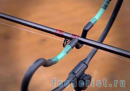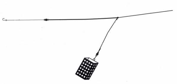 При ловле в стоячей воде и использовании длинных поводков, особенно на мягком илу, чувствительность такой фидерной оснастки снижается. Поводок может лежать в воде неровно – поэтому первые прикосновения рыбы могут не дойти до квивертипа. К тому же, кормушка вместе с выходом отвода на поводок может погрузиться в отложения или тину, что также мешает передаче поклевки. Решает эти проблемы следующий вариант оснащения.