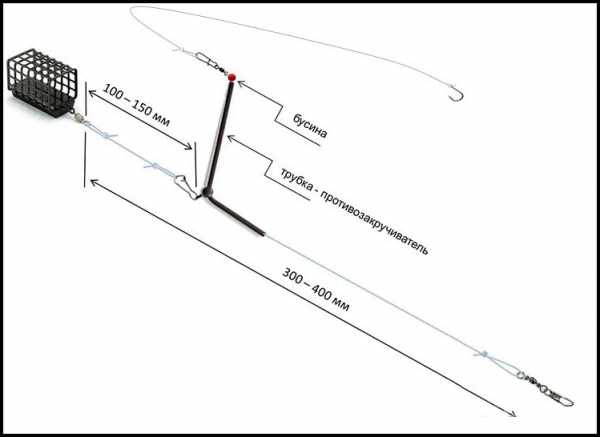 - Оснастка для фидера с противозакручивателем. Особенностью монтажа является крепеж кормушки на трубке, через которую продевают основную леску. Но наличие большого количества дополнительных элементов мешает ловить осторожную рыбу.