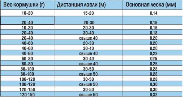 В завершение хочу привести таблицу соотношения веса кормушки, диаметра основной монолески и дистанции ловли.