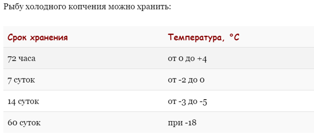 Срок хранения более продолжительный, что обусловлено низким содержанием влаги, высокой соленостью и бактерицидными свойствами холодного дыма. Например, сельдь и скумбрия хранятся 45―60 дней, если поддерживать рекомендованный режим -2…-5 ºС. Палтус холодного копчения рекомендуется хранить не больше 10 дней. Другие породы рыб лежат до 75 дней.