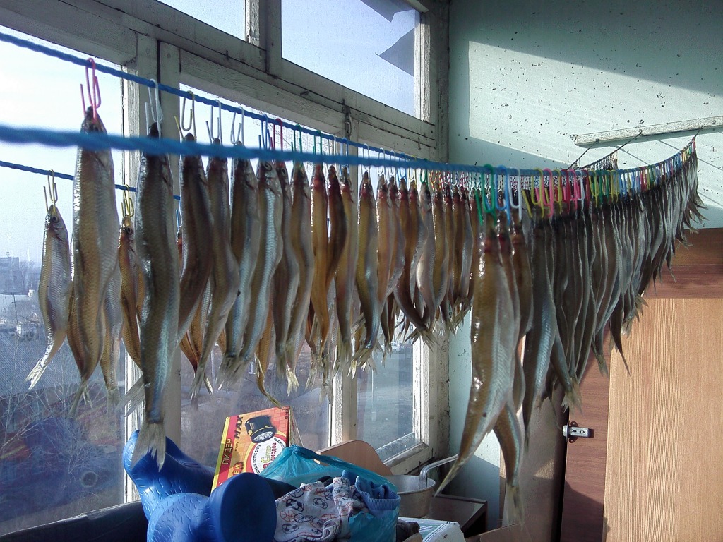Зимой вялят в жилом помещении на расстоянии от плиты и приборов отопления. Под рыбу подставляют посуду для сбора капающего жира.